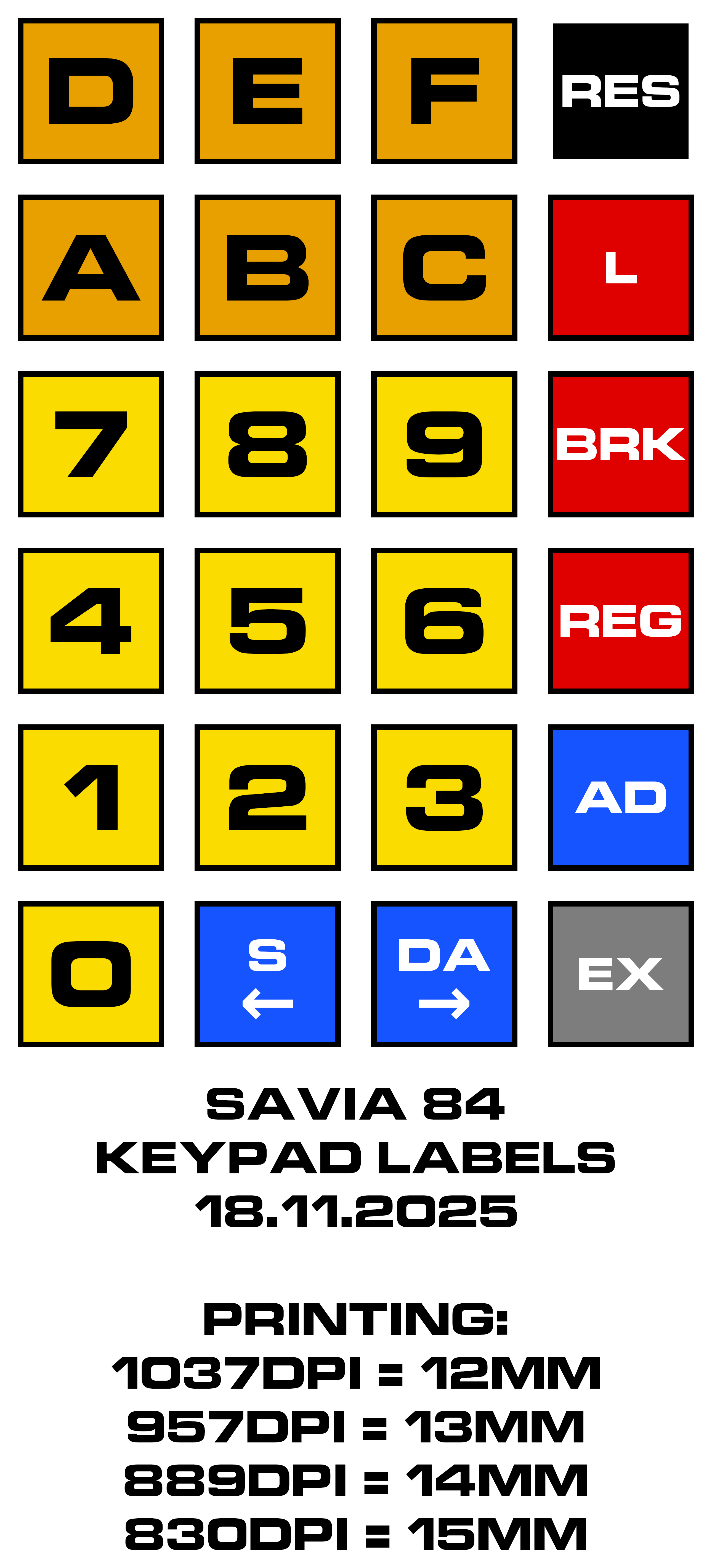 PNG image, 281 KB - Keypad labels for printing, intended for use with transparent cover keycaps. Measure how much space is under the keycap covers before printing; there's a DPI guide on the image to aid in getting the labels to print at the right size. Make sure to cut out the labels around the inside of the black outlines.
