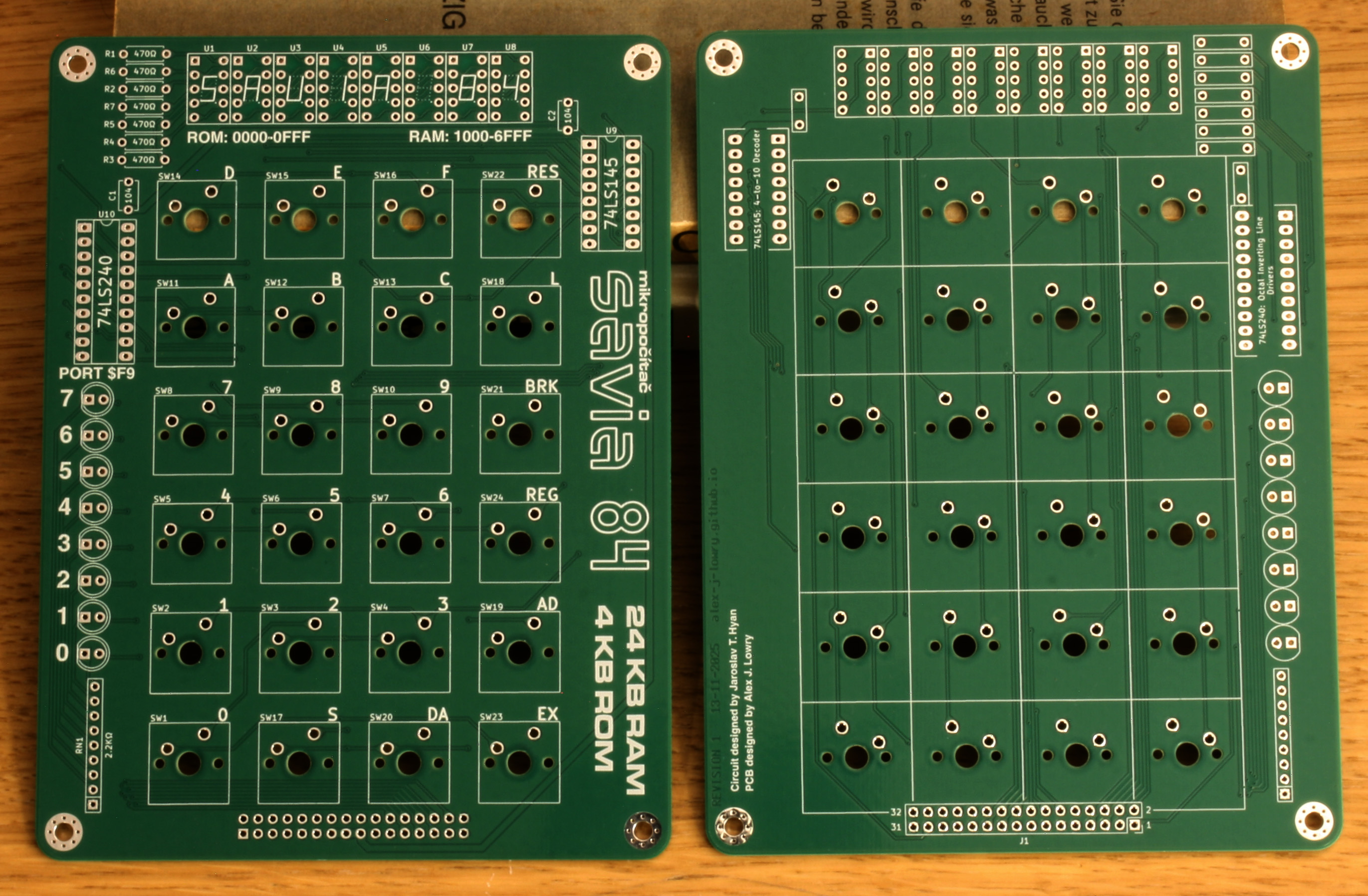 ZIP archive, 12.3 MB - Jaroslav's original schematics for the Savia 84. Note that "pin 16" of the 3205 decoder in the 1990 schematic is actually pin 15; VCC should be connected to pin 16.