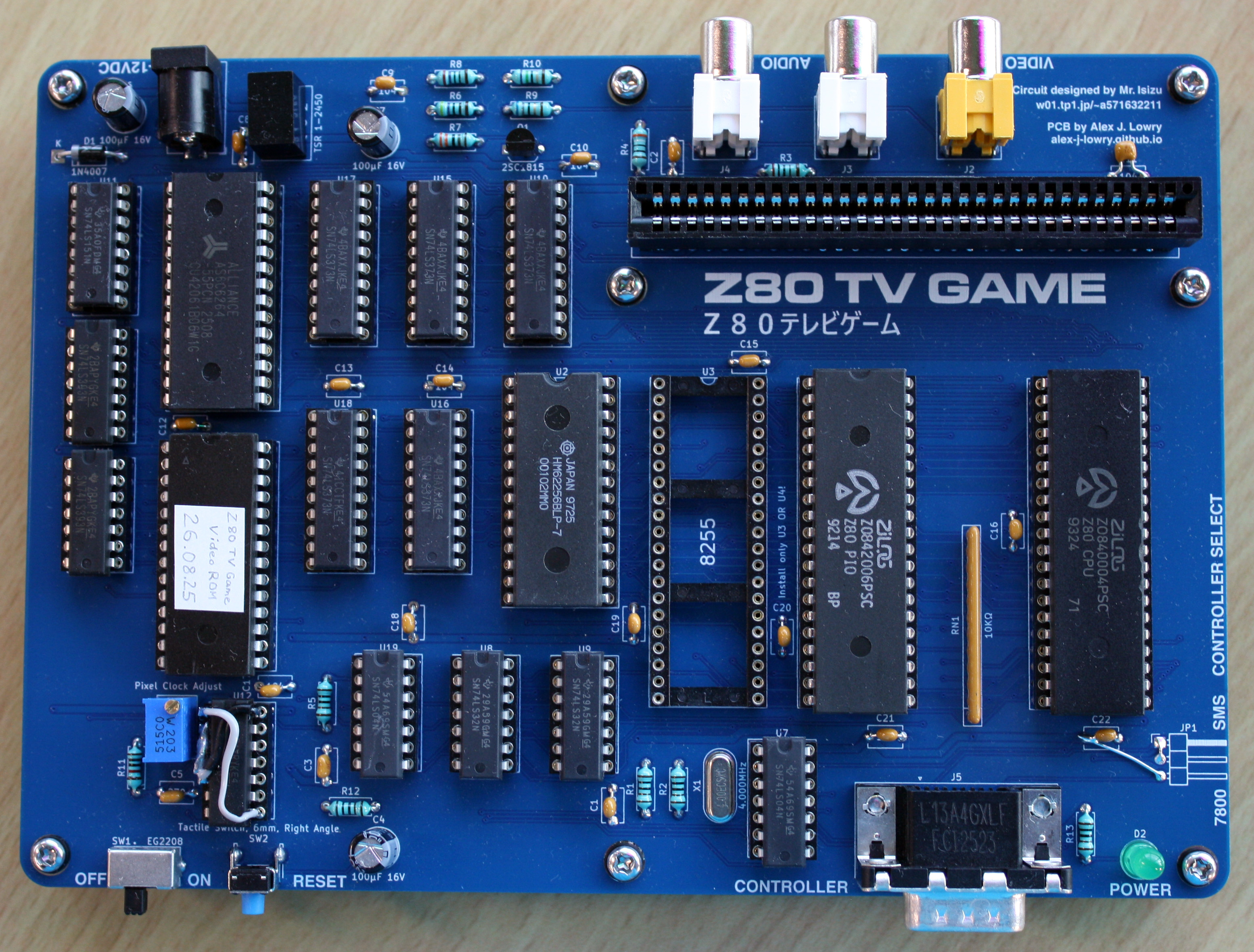 Controller input and audio output are handled by either an Intel 8255 or Zilog Z80PIO I/O controller. There are two sockets on the PCB for either controller, depending on which is easier for you to obtain. These two ICs have to be controlled slightly differently by software, but it's possible to write games that are compatible with both, as demonstrated by the games written by Inufuto.